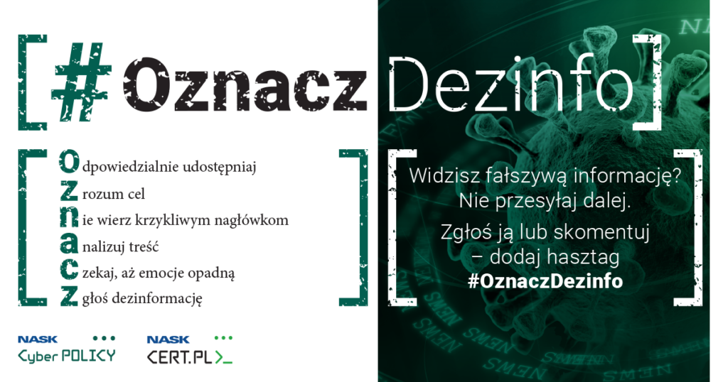 Dlatego w NASK powstała kampania #OznaczDezinfo, która zachęca użytkowników do proaktywnych postaw w internecie: oznaczania oraz zgłaszania dezinformacji. Samo hasło kampanii stanowi jednocześnie akronim, którego rozwinięcie przybiera formę poradnika dla internautów.