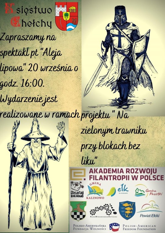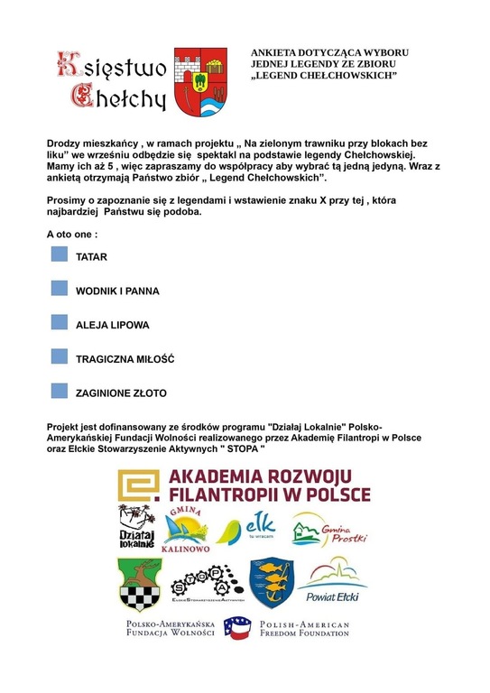 Komunikacja międzyludzka oraz integracja społeczna to dwa główne cele zrealizowane w ramach projektu " Na zielonym trawniku przy blokach bez liku realizowanego przez Stowarzyszenie Księstwo Chełchy. Projekt trwał cztery miesiące: od lipca 2020r do końca października 2020r. Zaczęliśmy od stworzenia ankiety składającej się z pięciu Legend Chełchowskich ( które zostały stworzone przy poprzednim projekcie pt. " Tworzenie wspólnej historii" ) aby wraz z mieszkańcami wybrać tą jedną - zwycięską legendę, łatwo nie było bo każda z nich miała swoich fanów, ale udało się , zwyciężyła Aleja Lipowa do której stworzyliśmy scenariusz do przedstawienia. Przeprowadziliśmy casting do ról w spektaklu i wyłoniliśmy aktorów. Następnie zaczęły się próby, tworzyliśmy choreografię i scenografię, pomysłów było wiele ale wspólnymi siłami doszliśmy do porozumienia. I zaczęło się zbieranie materiałów do scenografii i Kartonowego Musicu oraz szukanie kostiumów i rekwizytów przy czym mieliśmy niezły ubaw. I tak doszliśmy do epickiego momentu ( epickiego dla nas - mieszkańców) czyli do spektaklu. Nie było łatwo, trema dopadła każdego aktora widząc swoich sąsiadów. Sąsiadów młodych, starszych i oczywiście nie mogło zabraknąć dzieci i młodzieży, siedzących przed trawnikiem, czyli sceną. Po spektaklu aktorzy oraz widzowie poszli na wspólny poczęstunek, rozmowom nie było końca - jupi. Niestety nasza radość nie trwało długo ponieważ Covid-19 wrócił ze zdwojoną siłą i postawił nas do pionu, dlatego ostatnie działanie czyli Kino na zielonym trawniku odbyło się kameralnie. Mieliśmy okazję pokazać jak powstawał spektakl oraz mieliśmy możliwość oglądnięcia go na dużym ekranie co dało nam powód do dumy. Po pokazach rozpoczęliśmy wspólne oglądanie filmu. Będziemy powtarzać seanse filmowe jak tylko nadarzy się okazja, ponieważ mieszkańcy wyrazili chęć ponownego spotkania się z sąsiadami gdy pandemia choć na chwilę przystopuje.