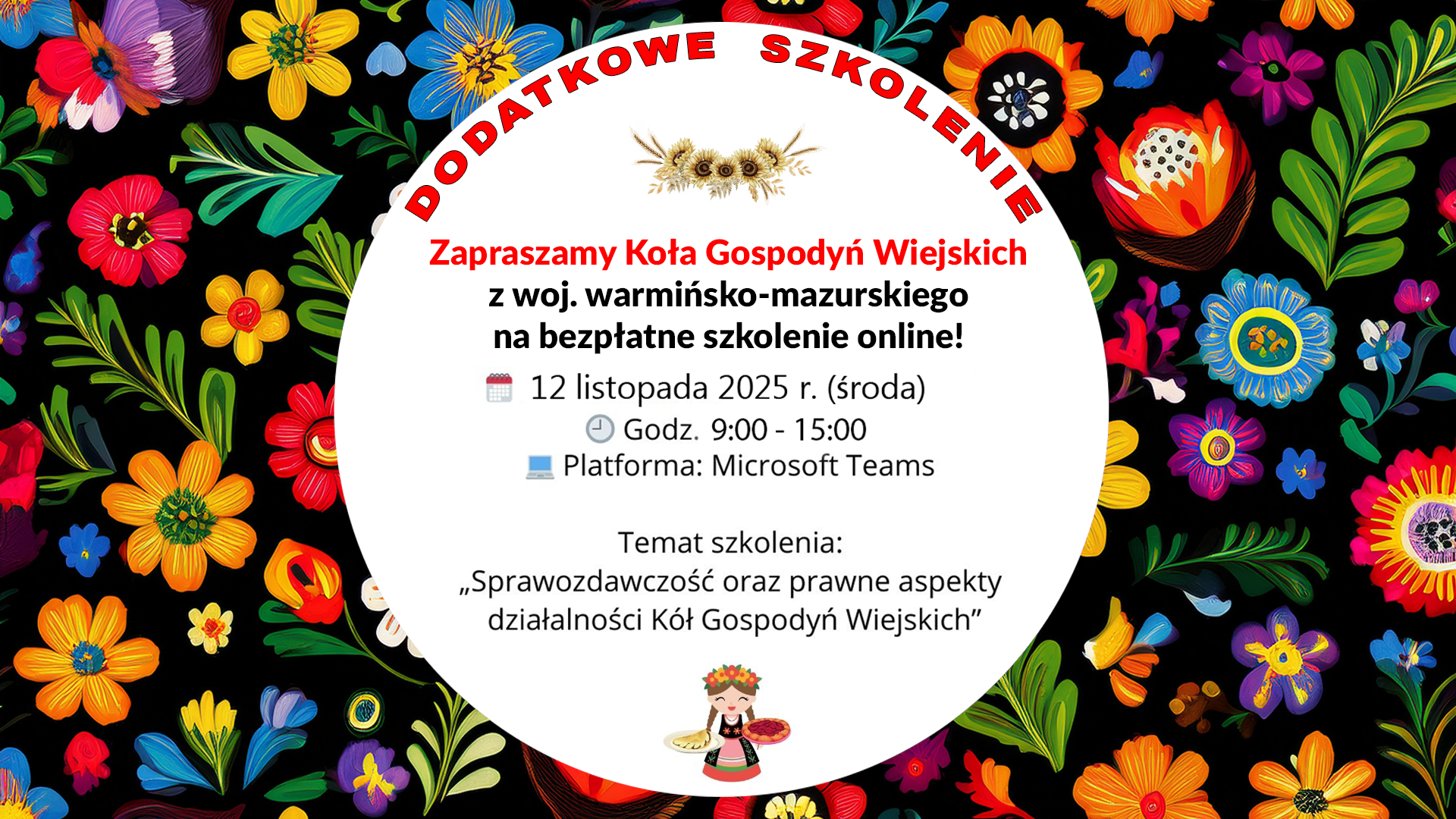 Wychodząc naprzeciw oczekiwaniom członkiń i członków Kół Gospodyń Wiejskich z regionu Warmii i Mazur, z prośbą o zorganizowanie dodatkowego bezpłatnego szkolenia praktycznego online pt. „Sprawozdawczość oraz prawne aspekty działalności Kół Gospodyń Wiejskich” dla osób którzy nie mogli wziąć udziału w szkoleniu w dniu 30.09.2025.